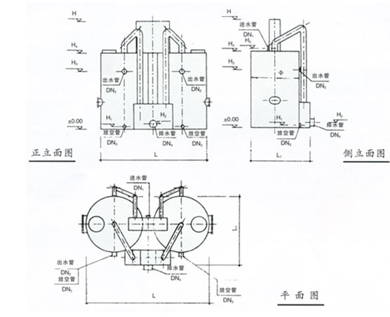 注:處理水量大于150M3/H時,需多格濾罐組成,可根據(jù)具體條件靈活布置。設(shè)備外形有圓形或方形可選。