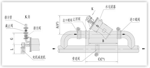 型號 | 管徑 (mm) | 過濾流量 (m3/h) | 過濾面積 (cm3) | 排污閥DN (mm) | 一次清洗 水量(L) | 電機(jī)功率 (KW) | 重量 (Kg) | D (mm) | A (mm) | A (mm) | B (mm) | C (mm) | C (mm) | L (mm) | G (mm) |