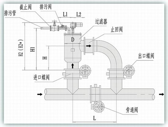 型號 | 管徑 (mm) | 過濾 流量 (m3/h) | 過濾 面積 (cm2) | 排污 閥DN (mm) | 一次清 洗水量 (L) | 電機(jī) 功率 (KW) | 重量 (Kg) | D (mm) | H (mm) | H1 (mm) | H2 (mm) | H2 (mm) | L1 (mm) | L2 (mm) | L (mm) |