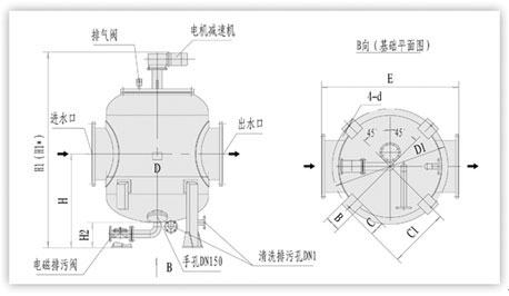 型號 | 管徑 mm | 過濾 流量 m3/h | 過濾面積 cm2 | 電磁排污閥DN1 mm | 一次清洗水量L | 清洗排污閥DN1 mm | 電機(jī)功率 KW | 重量 Kg | D mm | H mm | H1 mm | H1 mm | H2 mm | E mm | D1 mm | B mm | C mm | C1 mm | D mm |
